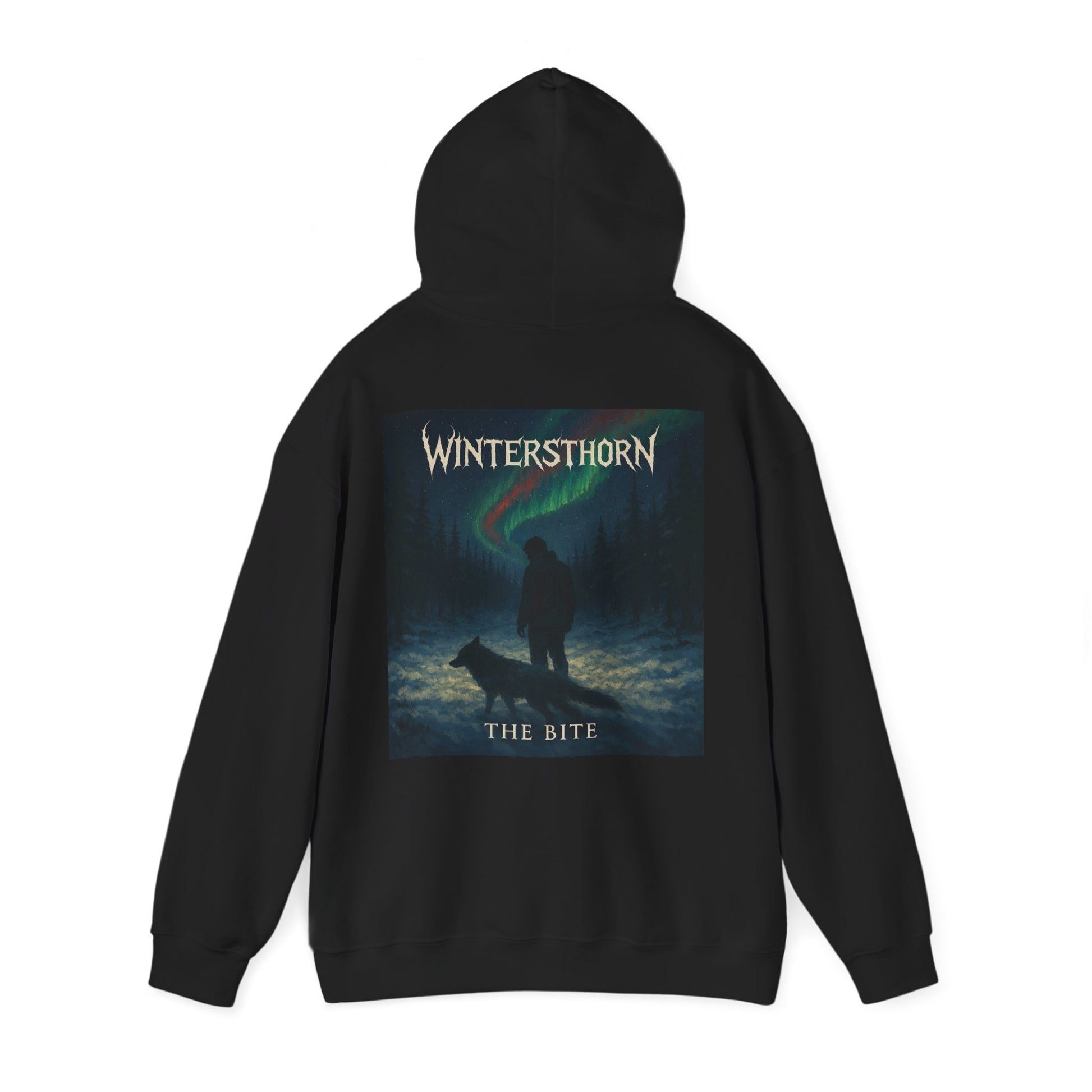 A rugged, cozy hoodie that brings a moody, story-driven vibe to cold nights. The heavyweight fabric and double-lined hood wrap you in warmth while the spacious kangaroo pocket keeps hands and small essentials protected. The back artwork evokes a starlit, northern wilderness — a solitary figure and a loyal dog beneath an aurora — creating a wearable scene that feels like a late-night trek or a quiet cabin evening. Durable blended fibers resist shrinking and wear, and clean construction (no side seams, tear-away label) keeps the silhouette simple and comfortable. Wear it for evening hikes, road trips, or when you want to carry a little northern mystery into everyday life.